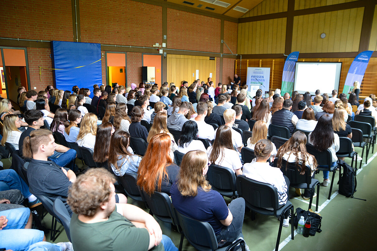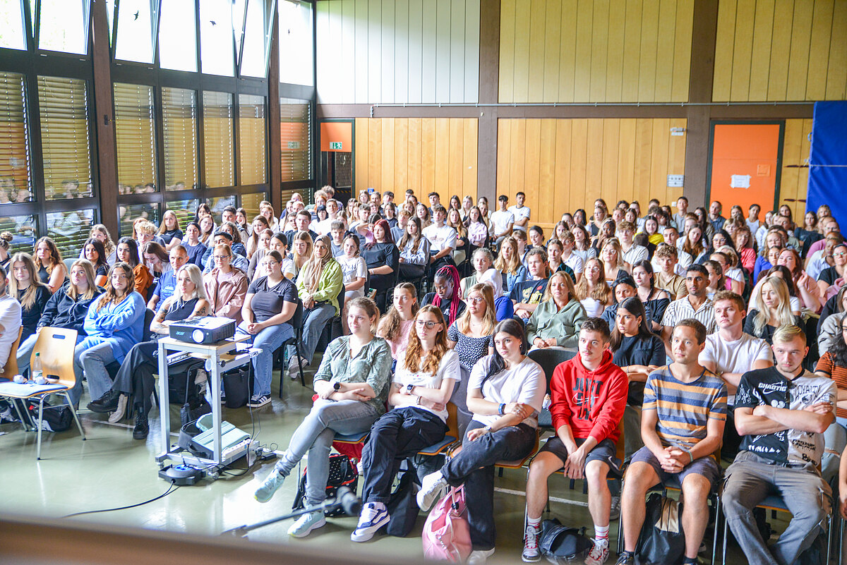 An diesem ersten Tag steht das erste Kennenlernen im Mittelpunkt: Sich untereinander, wichtige Ansprechpartner, Schulleitungen und Lehrkräfte, die einen Einblick geben, was die Schülerinnen und Schüler in den kommenden drei Jahren erwartet – aber auch, was von ihnen erwartet wird: „Wir wünschen uns, dass Ihr Verantwortung übernehmt, dass Ihr Fehler macht, aus ihnen lernt – und dazu steht. Wir wünschen uns Zuverlässigkeit und Pünktlichkeit und dass Ihr um Hilfe bittet, wenn Ihr sie braucht. Und wir wünschen uns, dass Ihr mit viel Freude in Euer Berufsleben startet“, sagt Personaldirektorin Denise Holl.