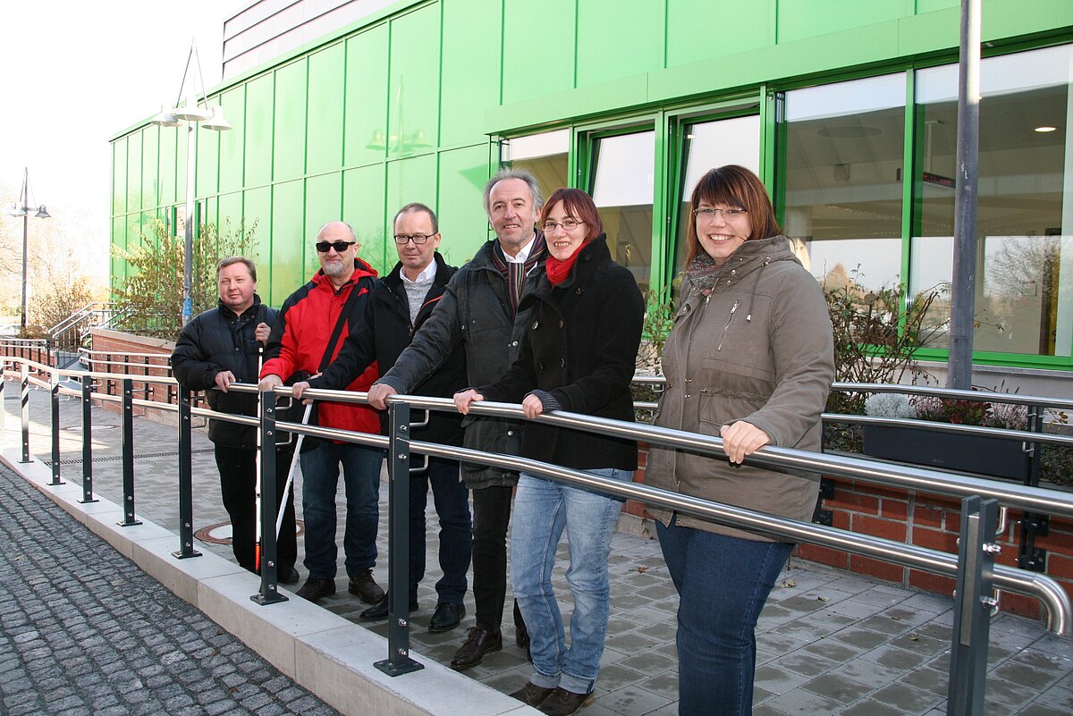 Ortstermin am neuen barrierefreien Zugang zum Klinikum: Manfred Korn und Reinhold Richter vom Behindertenbeirat der Stadt Bayreuth, der stellvertretende Technische Direktor der Klinikum Bayreuth GmbH, Thomas Lauterbach, Architekt Karl-Heinz Greim und seine Mitarbeiterin Anika Fischer sowie die stellvertretende Behindertenbeauftragte der Stadt, Nancy Kamprad (von links), nahmen das Bauwerk ab.