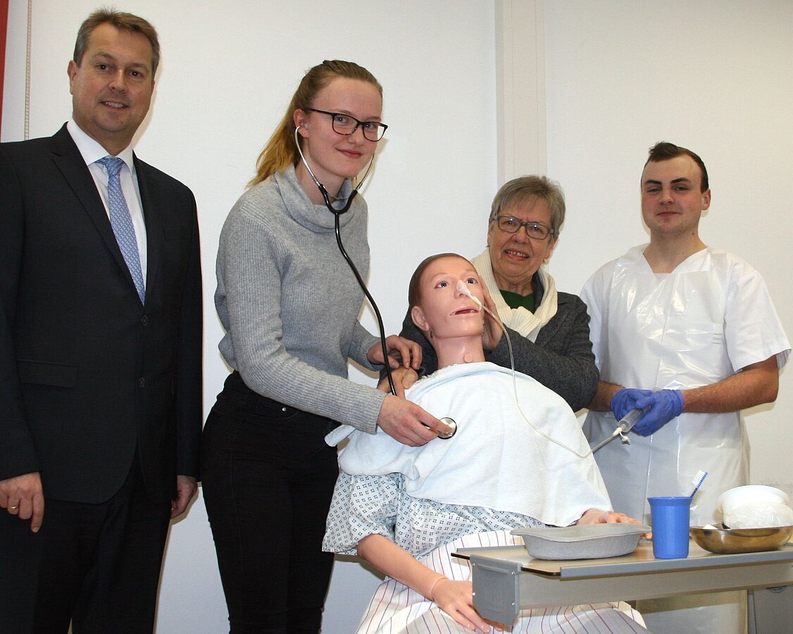 Keinen aus Fleisch und Blut, sondern aus Kunststoff und Gummi. An der neuen Pflegepupe können die Schülerinnen und Schüler nahezu alles testen, was in der Pflege ansteht. Waschen und Lagern, Verbände wechseln und Spritzen geben. Aber auch eine Magensonde zu setzen oder Abführmaßnahmen einzuleiten macht die Puppe, die von einem Spezialunternehmen aus Coburg gefertigt wurde, mit. Der Freundeskreis der Klinikum Bayreuth GmbH hat die 3200 Euro teuere Spezialpuppe finanziert. Lissi Weigel und Jürgen Dünkel aus dem Vorstand des Freundeskreises übergaben die Puppe jetzt an die Schulen. Karla Schulte (zweite von links) und Daniel Gläßel (rechts) untersuchten sie gleich mal.