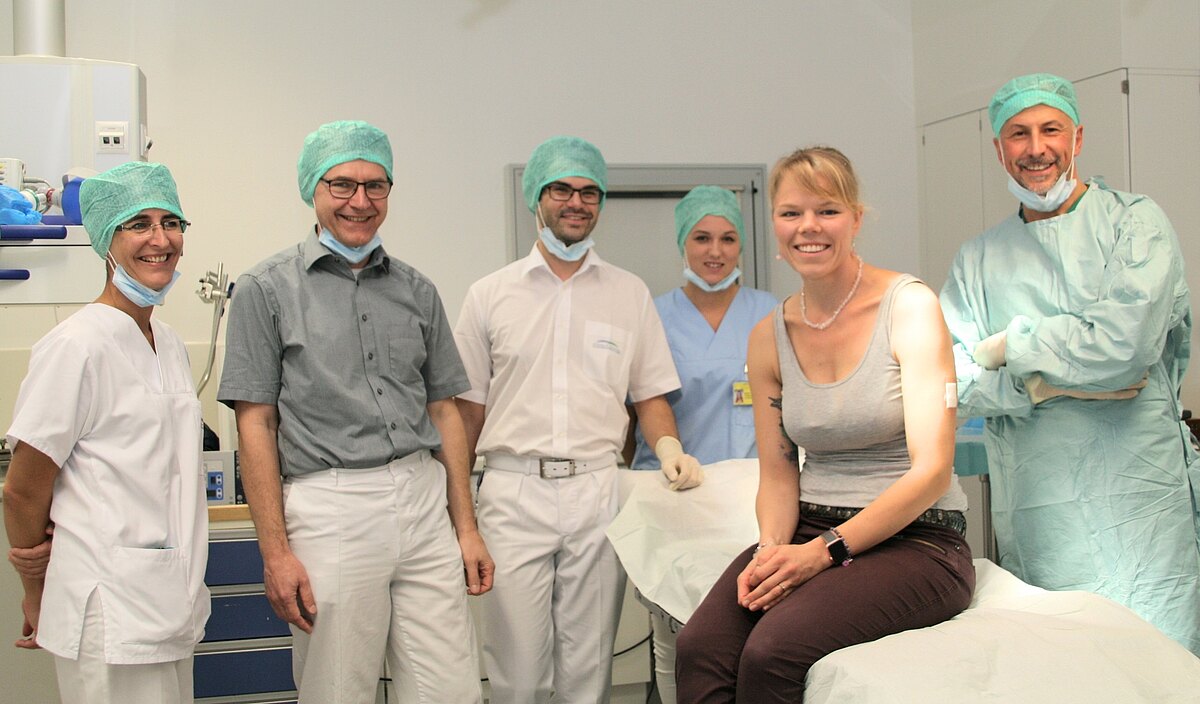 Premiere im Klinikum Bayreuth: Privatdozent Dr. Jürgen Dolderer (rechts) setzt Diabetes-Patientin Miriam Schraml (Zweite von rechts) den neuen Sensor ein, der künftig vor zu hohen und zu niedrigen Zuckerwerten warnt. Im Anschluss übernimmt das Diabetesteam um Diabetesberaterin Sandy Petermann und Privatdozent Dr. Steffen Mühldorfer (von links) die Betreuung der Patienten im zertifizierten Diabeteszentrum.
