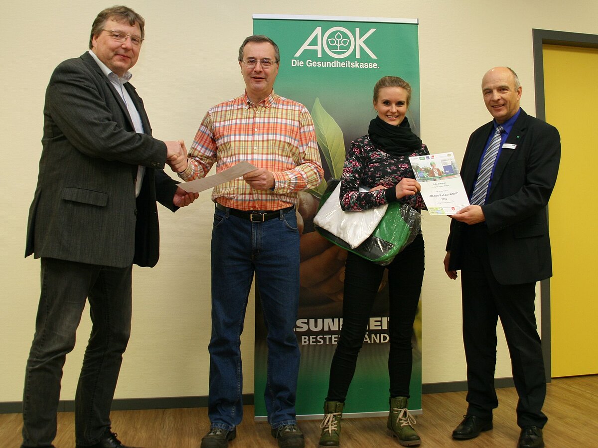 Glückwünsche für das stärkste Team: Der Vorsitzende des ADFC-Kreisverbandes Bayreuth, Stefan Steurer (links), dankte Jürgen Kothmann dafür, dass er 116 seiner Kolleginnen und Kollegen motiviert hat. Gert Kolb, Bereichsleiter Firmenkunden der AOK Direktion Bayreuth-Kulmbach, überreichte Julia Sommer einen Preis.