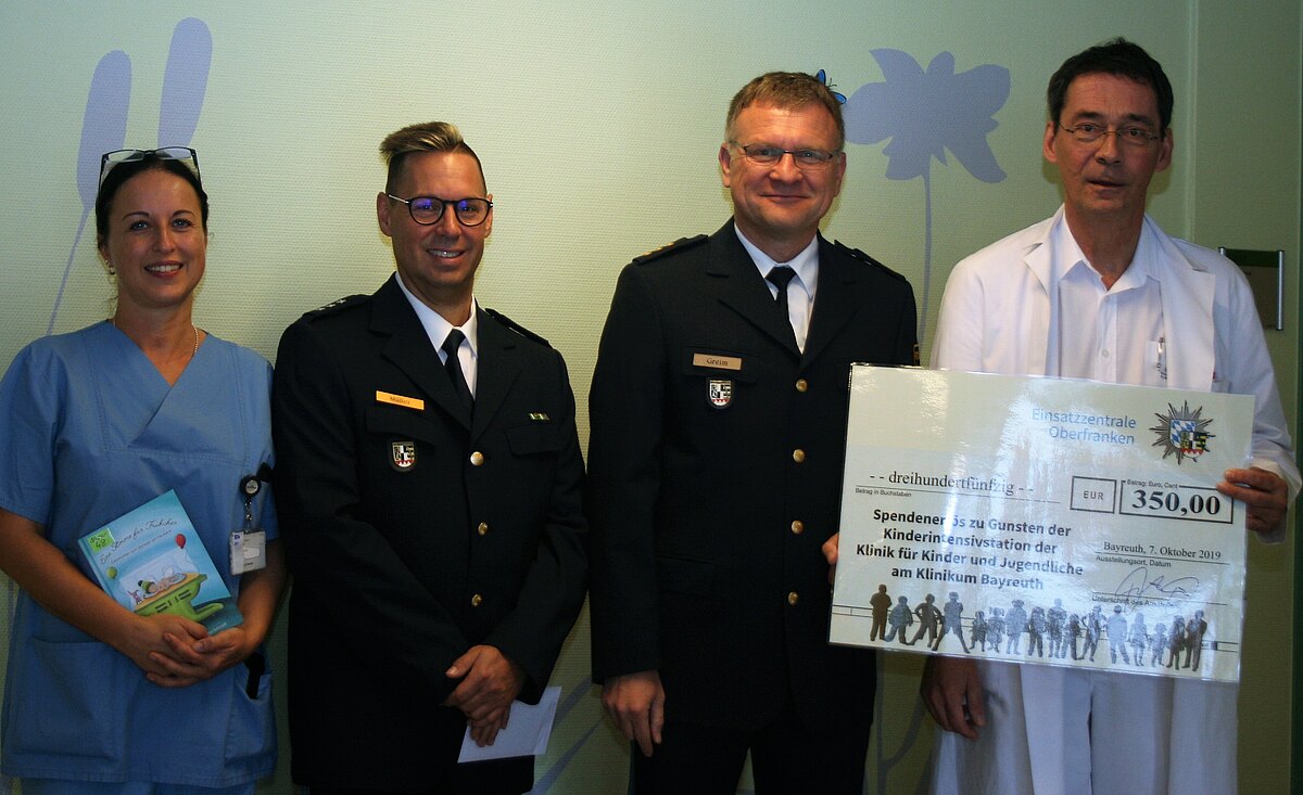 Die Intensivstation der Kinderklinik freut sich über die Spende der Einsatzzentrale des Polizeipräsidiums Oberfranken. Im Bild von links: Daniela Müller, Kinderkrankenschwester auf der Kinderintensivstation, Sachbearbeiter Matthias Müller und Sachgebietsleiter Günter Greim vom Polizeipräsidium Oberfranken sowie Prof. Dr. Thomas Rupprecht, Chefarzt der Kinderklinik der Klinikum Bayreuth GmbH.