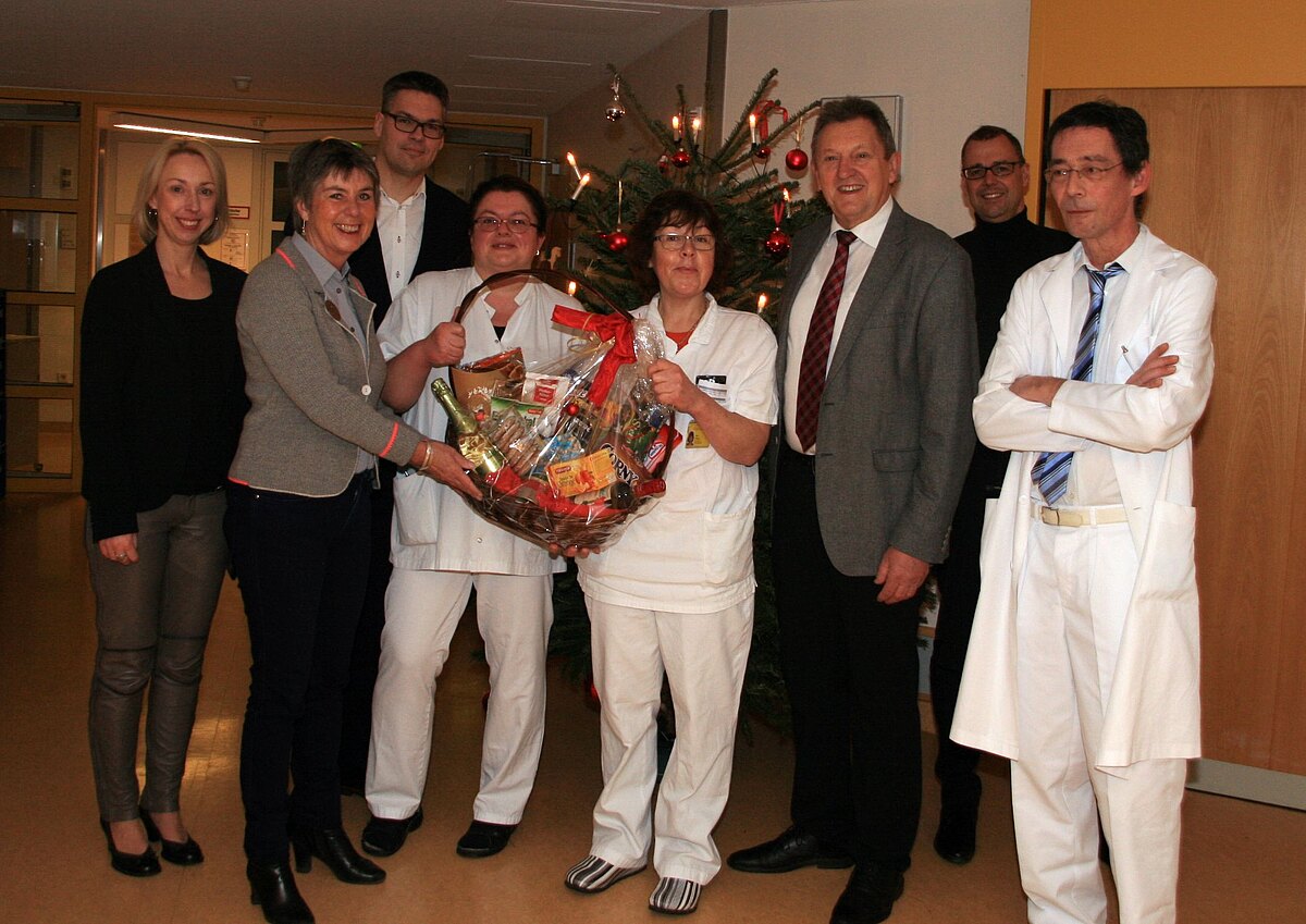 Sie nehmen sich Zeit für jene, die sich am Heiligen Abend und an den Weihnachtsfeiertagen im Klinikum und in der Klinik Hohe Warte um ihre Patienten kümmern: Brigitte Merk-Erbe, Oberbürgermeisterin und Aufsichtsratsvorsitzende der Klinikum Bayreuth GmbH, und Landrat und stellvertretender Aufsichtsratsvorsitzender, Hermann Hübner, haben stellvertretend für alle Beshcäftigten den Pflegeteams der Stationen 14 und 24 im Klinikum sowie der Station 6a in der Hohen Warte Weihnachtsgrüße und Präsentkörbe überbracht. Merk-Erbe und Hübner dankten den Mitarbeiterinnen und Mitarbeitern für ihr großes Engagement, das auch an den Feiertagen nicht nachlässt. Geschäftsführer Dr. Joachim Haun, der Ärztliche Direktor Prof. Dr. Thomas Rupprecht, sein zweiter Stellvertreter Dr. Hans Axel Trost, Pflegedirektorin Angela Dzyck, ihr Stellvertreter Wolfgang Erler und Thomas Reihl, Leiter der Allgemeinen Verwaltung, wünschen alle Mitarbeiterinnen und Mitarbeiter der Klinikum Bayreuth GmbH ein frohes Weihnachtsfest und ein gesundes neues Jahr.